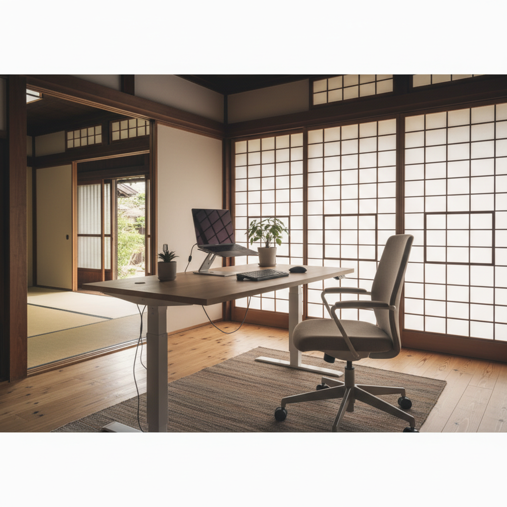 古民家は、現代の住宅と比べて間取りが独特だったり、あまり広くない空間が多いですよね。そのため、家具選びにはかなり悩みました。FLEXISPOT E7Bは非常にシンプルなデザインなので、私が選んだ木製天板と組み合わせることで、古民家の素朴な雰囲気にも違和感なく溶け込んでくれました。