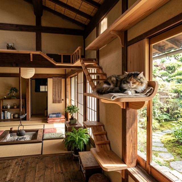 古民家は猫との暮らしに最高の素材を提供してくれます。太い梁、広い空間、自然素材の床——猫が本能的に喜ぶ要素がすべて揃っています。